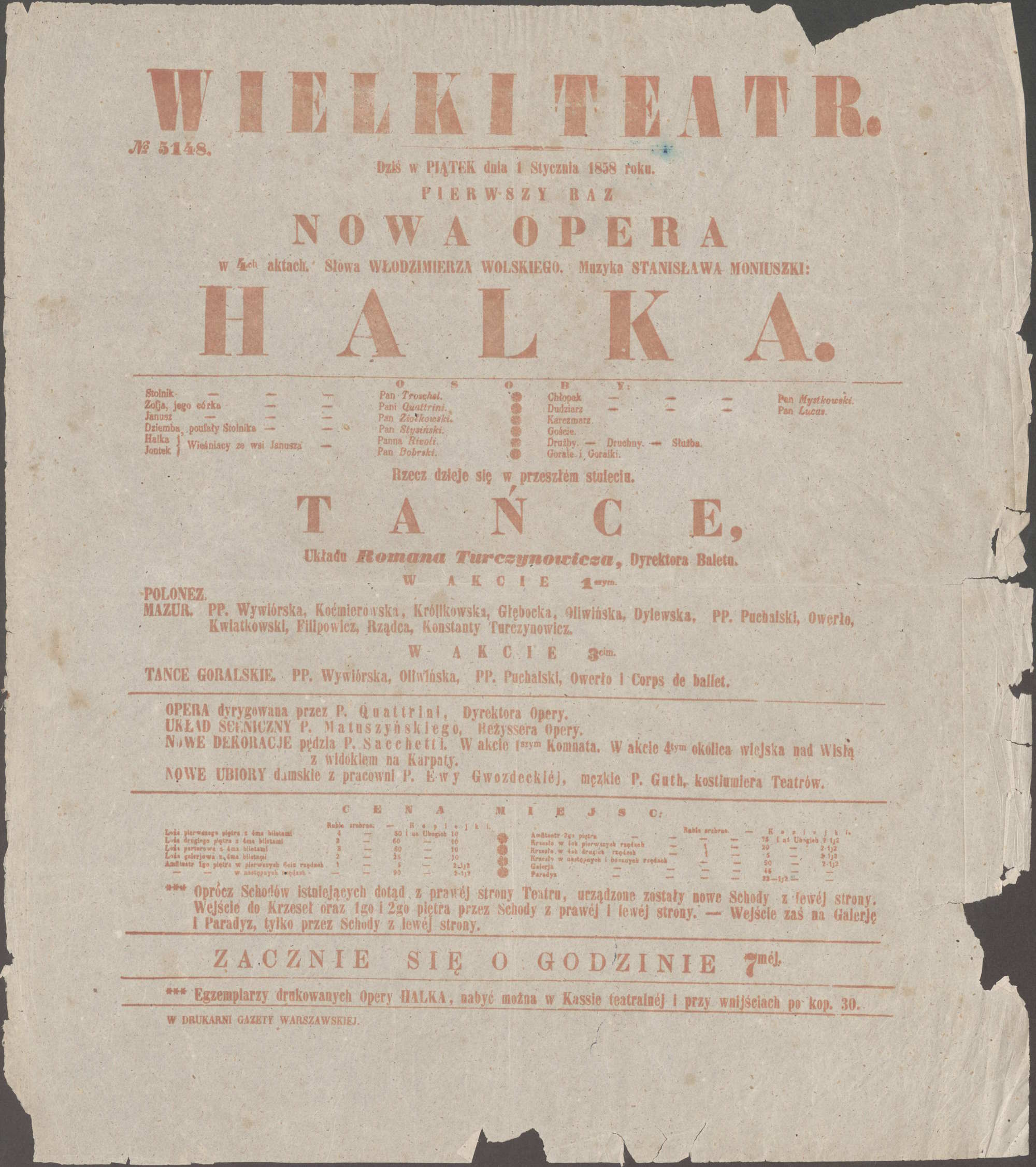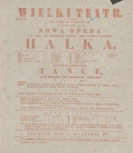 1 stycznia 1858 roku w Teatrze Wielkim odbyła się prapremiera czteroaktowej wersji Halki, która stała się najważniejszym wydarzeniem w dziejach polskiej opery i ugruntowała pozycję kompozytora. Data ta uznawna jest za narodziny opery polskiej. 9 grudnia 1900 roku odbyło się 500. przedstawienie pod batutą Emila Młynarskiego. Do 1935 roku liczba wystawiono tę operę tysiąc razy. W kolejnych latach Moniuszko Przygotowywał tu premiery swoich dzieł, w tym Straszny dwór w 1865 roku, przyjęty entuzjastycznie przez publiczność, choć zdjęty po kilku przedstawieniach przez cenzurę z powodu patriotycznego charakteru. W Teatrze Wielkim miały też miejsce premiery Hrabiny (1860) oraz Verbum nobile (1861).